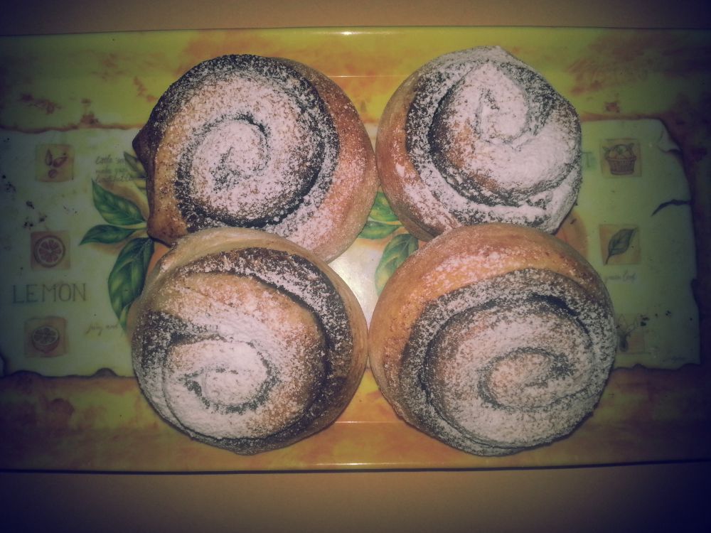 A kakaós porcukor keverékkel egyenletesen megszórjuk, majd feltekerjük, és kb. 2 cm-es csigákat vágunk belőle.