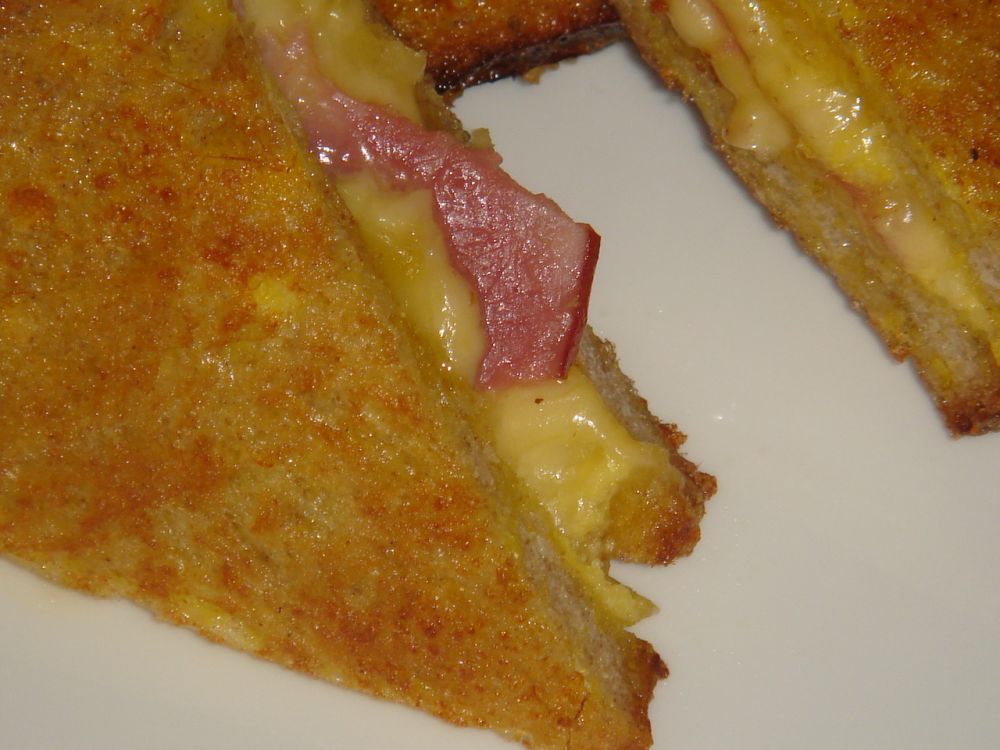 A sütőt előmelegítjük. A tojásokat felverjük egy tálban, hozzáadjuk a tejet, és ízlés szerint fűszerezzük. Négy kenyérszeletet megforgatunk a tojásban, (kicsit meg is nyomkodhatjuk villával, hogy jól magába szívja a tojást), majd sütőpapírral kibélelünk egy tepsit és erre fektetjük őket úgy, hogy lehetőleg ne érjenek össze. Ezeket a szeleteket megszórjuk reszelt sajttal, mindegyikre teszünk egy szelet sonkát, erre jön a hagyma és a kígyóuborka, majd újra reszelt sajt. Befedjük őket a maradék négy szelet tojásba forgatott kenyérszelettel.
